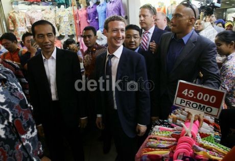 Jokowi dan Zuck sempat berbincang dengan sejumlah pedagang kain. Mungkin dalam kesempatan ini Jokowi menunjukkan para pedagang UKM. Zuck memang berkomitmen membantu para pedagang kecil di Indonnsia.