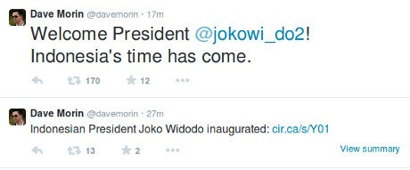 "Indonesian President Joko Widodo inaugurated," tulis Morin. Dalam postingan pertamanya itu, dia menyertakan tautan berisi foto dan tulisan mengenai perjalanan Jokowi menuju kursi RI 1.