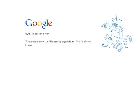 Berkunjung ke plus.google.com, pengguna yang ingin masuk ke situs tersebut hanya mendapatkan informasi "500.Thats an error. There was an error. Please try again later. Thats all we know."