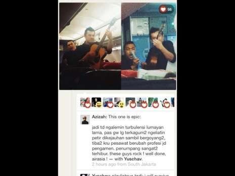 "Jadi tadi ngalemin turbulensi lumayan lama, pas gue lagi terkagum-kagum ngeliatin petir di kejauhan sambil bergoyang-goyang, tiba-tiba kru pesawat berubah profesi jadi pengamen, penumpang sangat-sangat terhibur, these guys rock! Well done airasia! - with Yuschav," demikian kisah Azizah di Path.