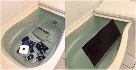 Wanita yang tak disebut namanya itu merendam iMac, iPhone, iPad dan sejumlah aksesoris berlogo apel kroak ke dalam bak mandi. Ia lalu memotret gadget Apple yang sedang 'mandi' dan kemudian mengirimkan foto itu ke pacarnya.