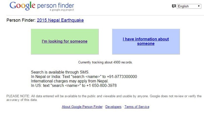 Google membuka kembali tool bernama Person Finder. Aplikasi berbasis web tersebut terdiri dari dua bagian. Bagi mereka yang ingin mengetahui nasib orang yang dikenalnya atau keluarganya di Nepal, bisa mengklik bagian I'm looking for someone. Jika ada yang ingin membagi informasi, tekan I have information about someone.