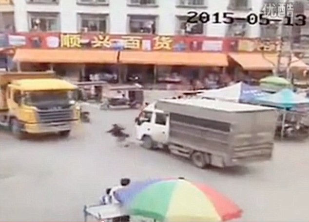 Malangnya saat sampai di tengah jalan, ia tertabrak sebuah truk besar berwana putih. Tak berhenti sampai di situ. Saat sudah tergeletak, korban kembali ditabrak truk lain, kali ini berwarna kuning.