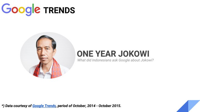 Kemudian topik yang paling dicari terkait Jokowi sendiri antara lain adalah Budi Gunawan dan Megawati, Bali Nine, Pelantikan Ketua Kapolri, Reshuffle Kabinet, serta Danau Toba dan Asap Riau. Terlihat urutan topik ini mengikuti isu yang berkembang selama setahun ke belakang.