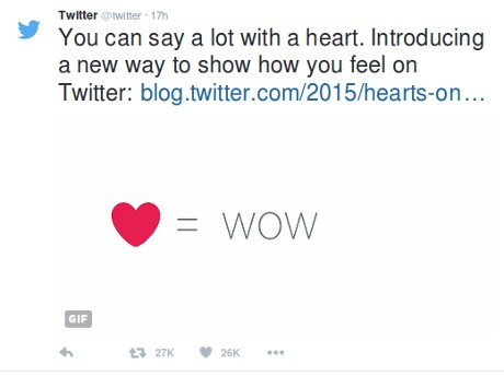 "You can say a lot with a heart. Introducing a new way to show how you feel on Twitter," demikian pengumuman yang disampaikan Twitter, Rabu (4/11/2015).