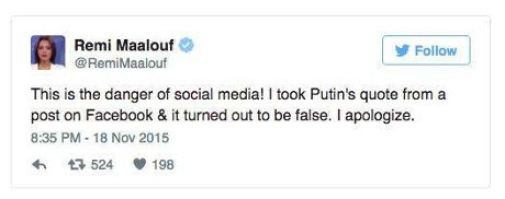 Media internasional, termasuk Fox News, ramai-ramai mengutip akun twitter penyiar berita Rusia Today, Remi Maalouf, yang menulis kutipan seolah-olah dari Putin. Banyak yang meyakini, Putin bicara langsung pada Remi sehingga kutipan itu seolah-olah benar.