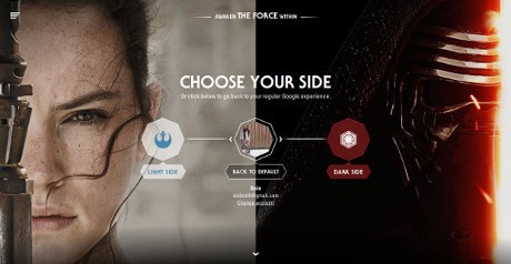 Dengan mengunjungi tautan www.google.com/starwars, kita seolah diajak ke dunia Star Wars dan bisa menentukan pilihan, apakah akan bergabung dengan tim Dark Side atau Light Side.