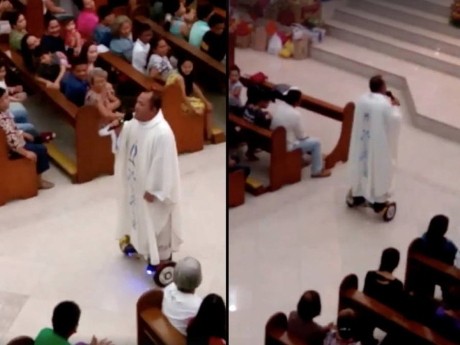 Bermain hoverboard memang menyenangkan, asalkan tahu tempat dan waktu. Aksi pendeta asal Filipina ini misalnya. Niatnya menggunakan hoverboard saat memimpin Misa Natal mungkin baik, hanya saja belum tentu bisa diterima semua pihak.