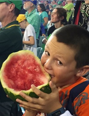 Sosok anak laki-laki , yang diketahui bernama Mitch, tertangkap kamera sedang lahapnya menyantap semangka berukuran sebesar bola kaki ketika menonton pertandiangan olahraga kriket Liga Big Bash antara Melbourne Stars-Melbourne Renegades yang disiarkan langsung sebuah stasiun TV di MCG Sabtu kemarin.