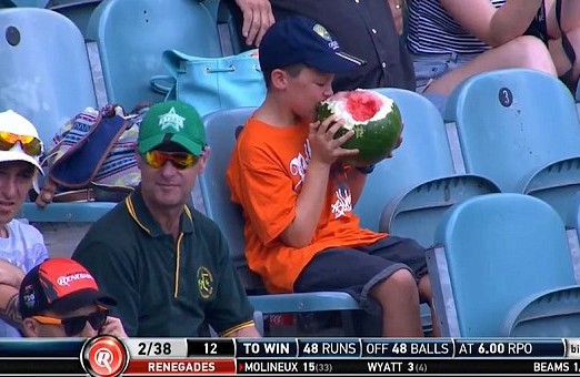 Maka, si anak 'rakus' bernama Mitchell Schibeci itu mendadak populer. Kamera televisi merekamnya asyik melahap semangka dalam pertandingan kriket di Melbourne, Australia, antara Melbourne Stars dan Melbourne Renegades.