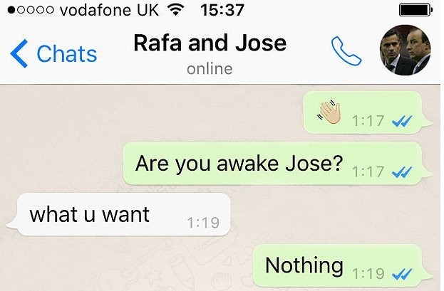 Ceritanya, Benitez susah tidur lalu ia menghubungi Mourinho melalui WhatsApp. "Apa kamu masih bangun Jose?" tanya Benitez. Mou rupanya juga tidak bisa tidur sehingga mereka pun bercakap-cakap.
