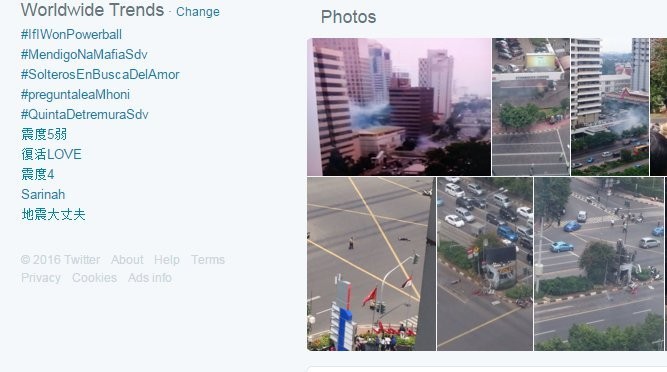 Ledakan yang terjadi di Jalan Thamrin, Sarinah, Jakarta langsung ramai dibicarakan oleh netizen di Indonesia, tepatnya di Twitter. Dalam waktu singkat, kata Sarinah langsung memuncaki trending topic Indonesia dan dunia.