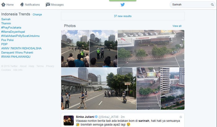 Ramainya kicauan seiring dengan foto-foto yang sesaat setelah kejadian langsung membanjiri Twitter. Rata-rata foto yang diposting menunjukkan kerusakan yang dialami pos polisi yang ada di pusat kota Jakarta itu.