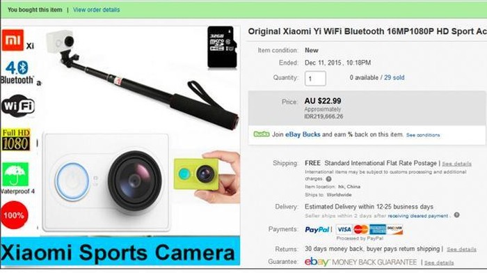 Pengalaman negatif ini baru saja dialami oleh Rizki dan dua orang temannya. Diceritakan Rizki, saat itu ia tengah melihat-lihat barang menarik di situs jual beli yang sudah populer, eBay. Hingga akhirnya pandangannya terfokus pada action cam Xiaomi Yi yang dijual dengan harga 22,99 dolar Australia atau sekitar Rp 220.000.