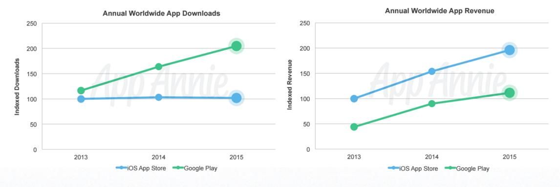 App Annie mencatat keuntungan yang didapat App Store 75% lebih banyak ketimbang Play Store. Jumlah tersebut lebih tinggi dibanding tahun lalu dimana App Store unggul 70% ketimbang Play Store.