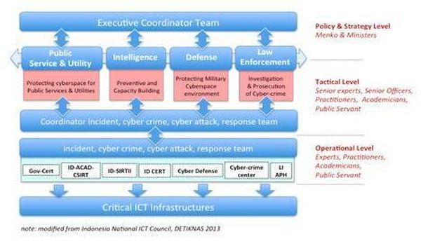 Kementerian dan Lembaga yang selama ini bekerja sendiri-sendiri, dapat mengacu pada kerangka pikir di atas dan mulai menentukan tim kecil yang akan menjadi bagian dari tim nasional Kedaulatan Cyber Indonesia. Tim Nasional ini akan bekerja dengan kerangka kerja dan hirarki seperti pada gambar berikut. Β