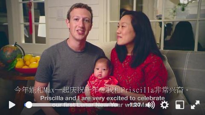 Melalui akun Facebooknya, Zuck mengajak istrinya Pricilla Chan dan putri mereka Maxima Chan Zuckerberg tampil dalam sebuah video. Dalam video berdurasi 1 menit 24 detik itu, Zuck dan keluarga kecilnya memberikan ucapan selamat Imlek dalam bahasa Mandarin.