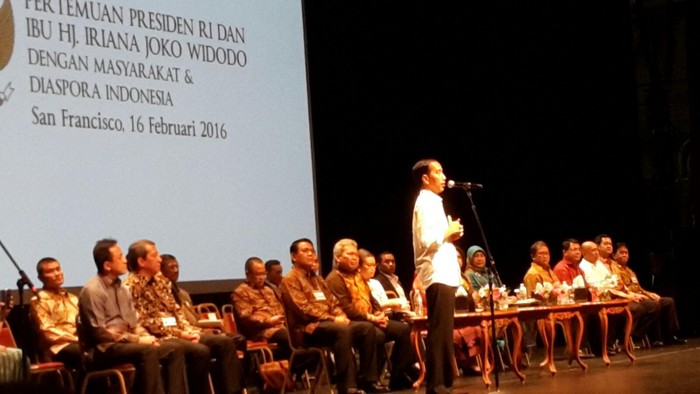 San Francisco - Presiden Joko Widodo menyempatkan diri menemui diaspora Indonesia di San Francisco, Amerika Serikat, sebelum mendatangi markas besar Google, Facebook, dan Twitter keesokan harinya.
