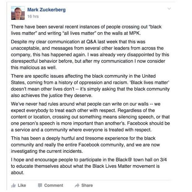 "Ada insiden di mana beberapa staf menuliskan candaan di 'Facebook Wall' soal kulit hitam dan secara langsung ditujukan pada aktivis yang memperjuangkan kekerasan terhadap kaum kulit hitam," sebut Zuckerberg.