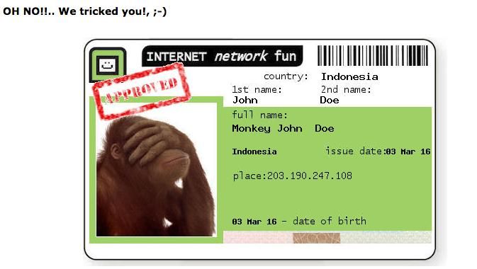 Ya, data paspor yang Anda harap-harapkan ternyata muncul dengan foto bergambar Orangutan yang sedang menutupi mata. Memang pada akhirnya, situs tersebut mengaku bahwa ini tak lebih dari sekadar lelucon.