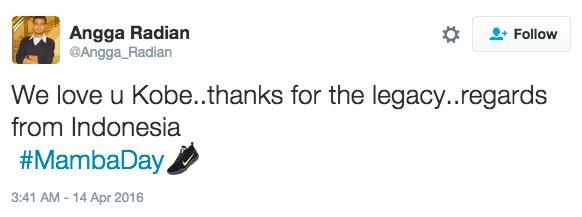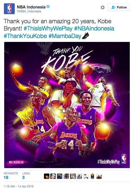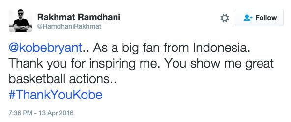 "Puncak percakapan terjadi pada pukul 21.56 waktu setempat dengan 100.000 tweet per menit. Hashtag #ThankYouKobe dan #MambaDay menjadi tagar yang paling banyak digunakan," sebut Twitter dalam keterangannya, Jumat (15/4/2016).