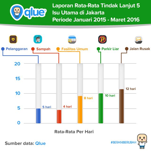 "Kami akan selalu memberikan update ranking pemerintah, user dan swasta secara berkala 3 bulan sekali. Ini kami lakukan untuk memberikan transparansi respons dari pemerintah, user, dan swasta di Qlue sehingga masyarakat dapat menilai kinerja pemerintah dari level kelurahan hingga kotamadya serta dinas dan staf," kata CEO Qlue Rama Raditya dalam keterangannya, Jumat (15/4/2016).