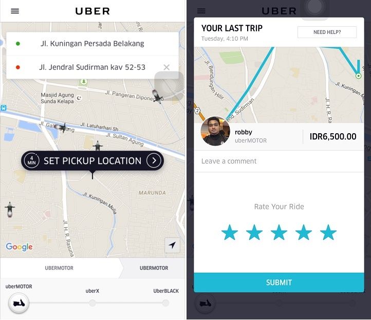 Namun ketika membuka aplikasi Uber, kami melihat ikon motor hitam di layar ponsel. Posisinya berada tidak jauh dari tempat kami berada. Spontan kami pun mengubah pikiran dan langsung memesan layanan ojek online milik Uber.