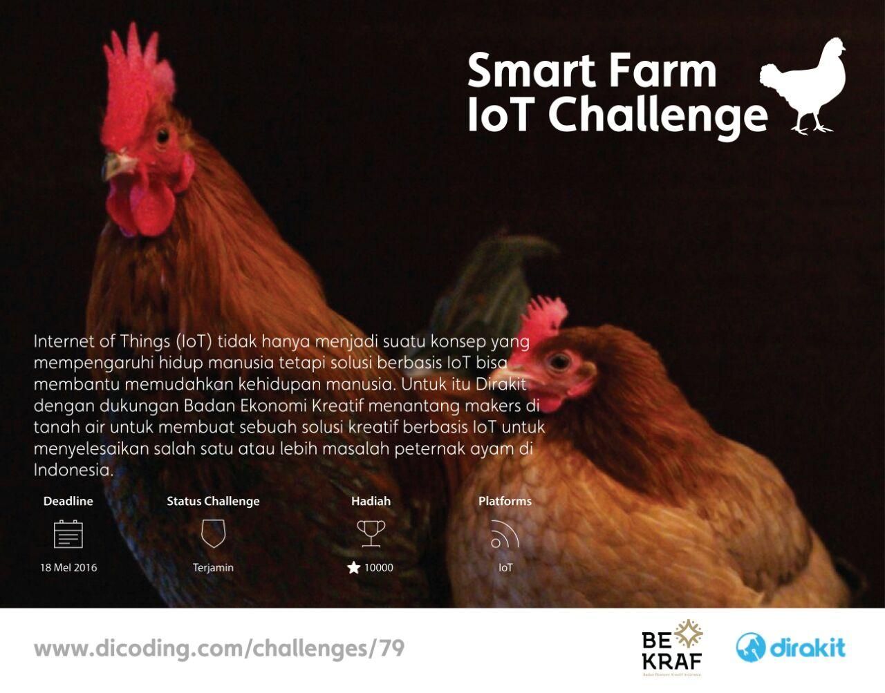 Komunitas IoT Dirakit, berkolaborasi dengan Badan Ekonomi Kreatif (Bekraf) dan platform developer hub Dicoding, menantang para developer membuat sebuah solusi kreatif berbasis IoT untuk menyelesaikan masalah peternak ayam di Indonesia.