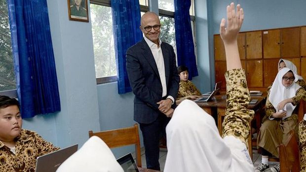 Selama kunjungan tersebut, orang nomor satu di Microsoft ini duduk dan berdiskusi bersama sekelompok siswa. Mereka membicarakan bagaimana teknologi Microsoft membantu proses belajar, salah satunya OneNote.