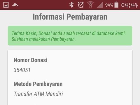 Setelah mengisi isian awal ini, pengguna akan diberikan opsi Lanjutkan. Dan, di antar muka berikutnya, akan muncul data berbasis isian awal seperti nomor donasi, metode pembayaran, nominal donasi, dan kode unik. Tak ketinggalan ada tanggal expired, sehingga keseriusan penyumbang sebetulnya sudah disortir sejak dini. Jika lewat, akan batal sendirinya.
