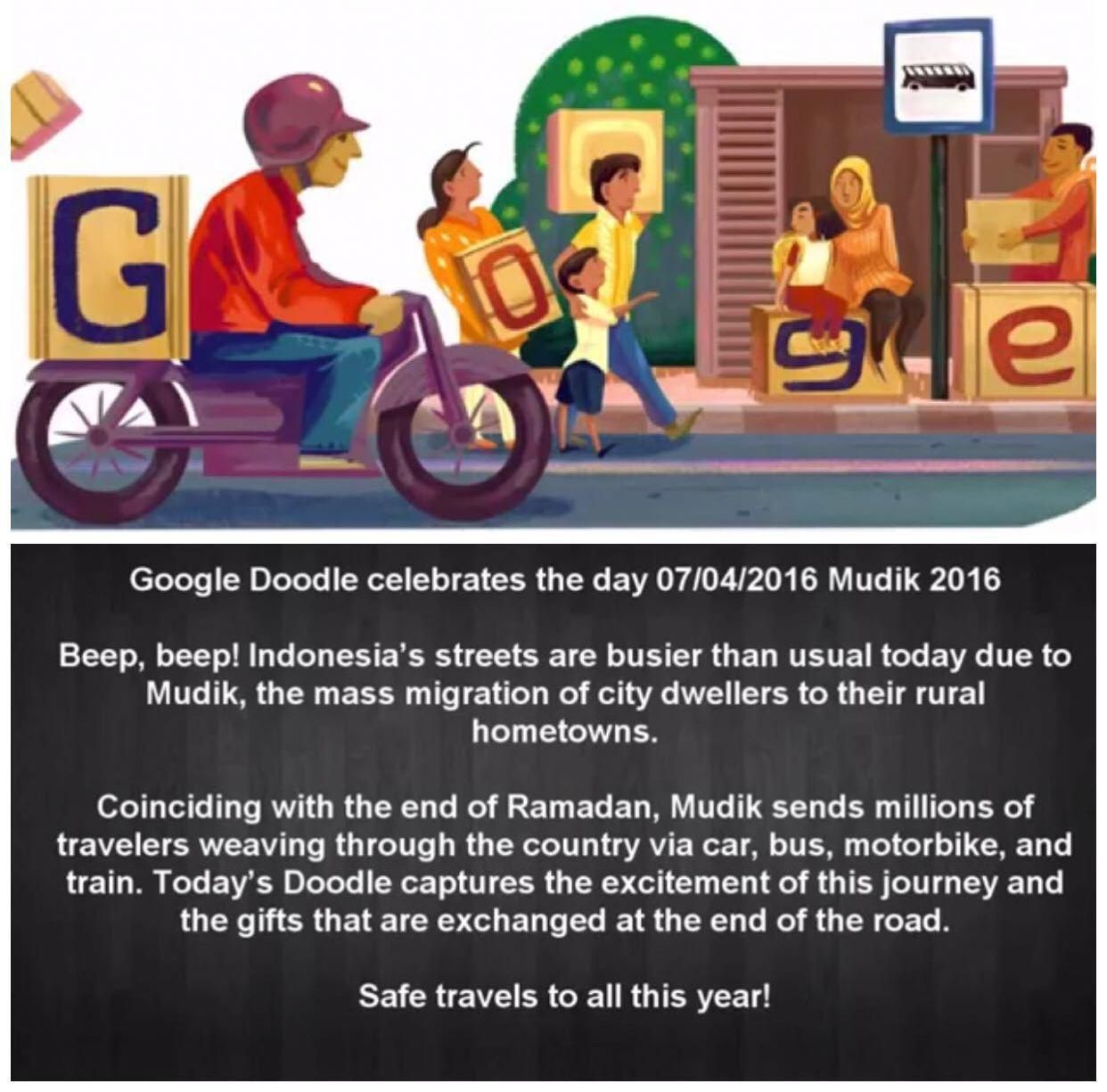 Google Doodle mudik diumbar sehari yang lalu (4/7/2016), dalam deskripsinya Google meyampaikan bahwa di akhir Ramadhan jalanan di Indonesia yang menuju daerah mengalami kesibukan gila-gilaan. Pasalnya di waktu tersebut, jalanan dipenuhi oleh arus pemudik yang jumlah mencapai puluhan juta orang.