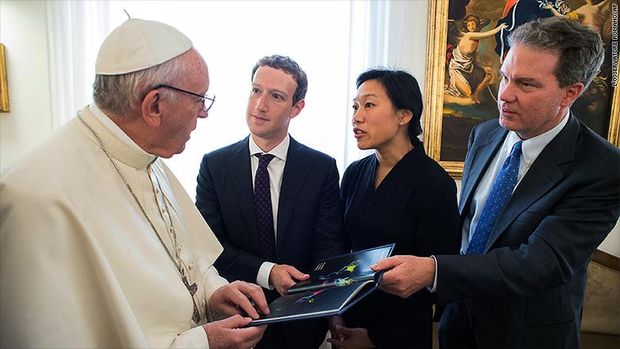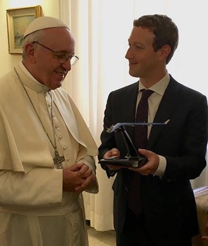 Zuck memajang foto saat dirinya memberikan Aquila kepada Paus Francis. Aquila adalah drone tenaga surya yang akan membantu memperluas akses internet hingga ke pelosok.