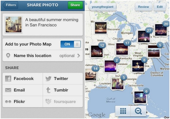 Photo Map memungkinkan pengguna melihat semua foto yang dibagi seseorang di berbagai lokasi di seluruh dunia. Foto akan ditampilkan dalam thumbnail pada map. Fungsi ini memudahkan untuk melihat foto dari lokasi tertentu, misalnya ketika pengguna berencana mengunjungi sebuah negara atau tempat.