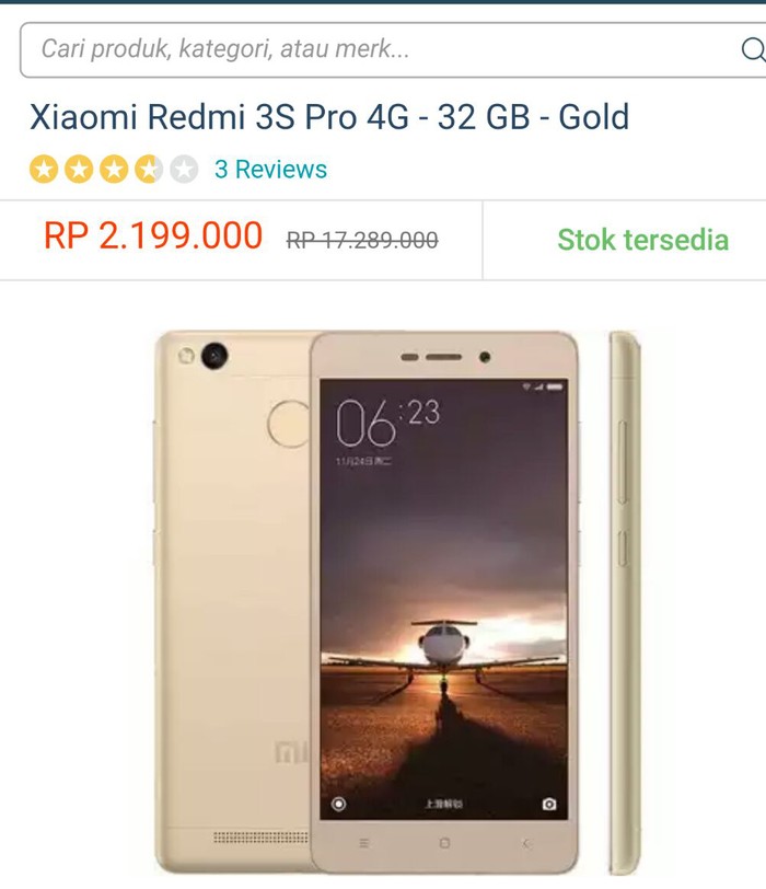 Sempat tertangkap basah detikINET, sebuah lapak di salah satu situs e-commerce menjual Xiaomi Redmi 3S Pro 4G 32 GB dengan harga yang tidak wajar, yakni Rp 17.289.000. Karena saat ini sedang ada pesta diskon, ponsel itu pun kemudian diberi diskon besar hingga harganya mencapai Rp 2.199.000.
