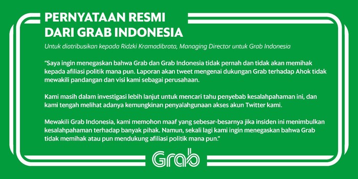 Saya ingin menegaskan bahwa Grab dan Grab Indonesia tidak pernah dan tidak akan memihak kepada afiliasi politik mana pun. Laporan akan tweet mengenai dukungan Grab terhadap Ahok tidak mewakili pandangan dan visi kami sebagai perusahaan.