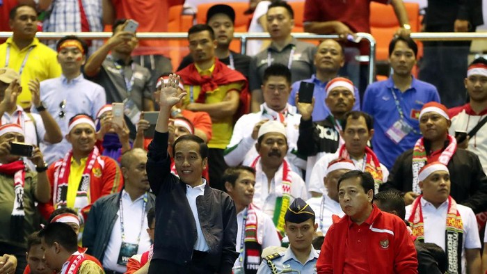Jokowi hadir di Stadion Pakansari, Cibinong, Bogor, Sabtu (3/12/2016) untuk memberikan semangat pada tim nasional Indonesia yang bertanding melawan Vietnam. Duduk di barisan penonton VIP, sang presiden tampak memakai baju putih dan jaket bomber berwarna hitam.
