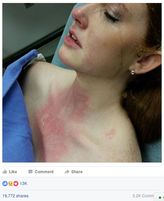 Wanita dalam foto ini adalah ibu satu anak bernama Molly Landis. Tampak luka bakar berwarna merah muda menyebar di area dada dan lehernya. Di keterangan foto, Molly mengisahkan bahwa luka bakar itu ia alami akibat insiden yang menimpanya saat di dapur.