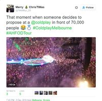 Pria yang diketahui bernama Lonardo Tanno ini berniat untuk melamar Felicia Lie, wanita yang sudah menjadi kekasihnya selama tiga tahun. "Terimakasih selama tiga tahun terakhir. Terimakasih untuk semua cintamu," ujar Tanno tak lama setelah ia diberikan microphone oleh Chris Martin.