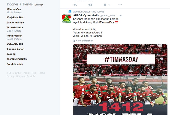 "Ayoo... Indonesia pasti menang #TimnasDay," kata pengguna Twitter dengan nama akun @AzisMessi.