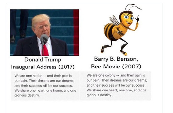 Film yang dimaksud adalah Bee Movie. Dalam meme yang sudah cukup ramai beredar, dikatakan kalau sebagian pidato Donald Trump juga sangat mirip dengan perkataan salah satu karakter di film tersebut.