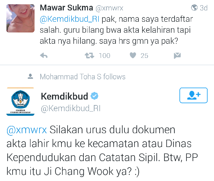 "Pak, nama saya terdaftar salah. Guru bilang bawa akta kelahiran tapi aktanya hilang. Saya harus gimana ya pak?," kicau akun dengan nama asli Mawar Sukma itu.