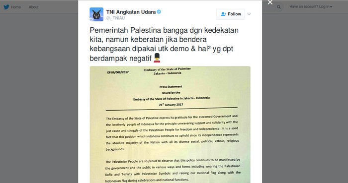 "Pemerintah Palestina bangga dgn kedekatan kita, namun keberatan jika bendera kebangsaan dipakai utk demo & hal yg dpt berdampak negatif," tulis akun Twitter @_TNIAU pada 18 jam lalu seperti dilihat detikcom, Kamis (26/1/2017).