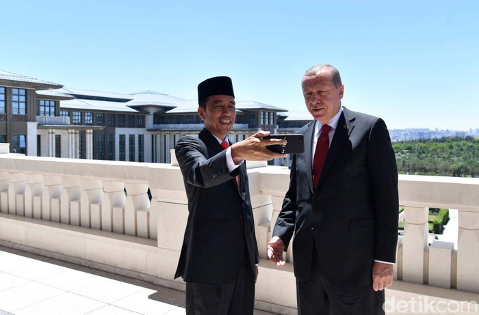 Presiden Jokowi yang memakai peci hitam itu langsung mengarahkan lensa kamera ponselnya ke wajah Erdogan. Presiden ke-12 Turki itu pun tersenyum sebelum berbicara.