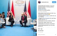 Itu karena ada beberapa foto Trump bersama presiden Jokowi yang dipajang di akun Instagram tersebut. Yang pertama ketika Trump bersama Jokowi berdiri berdampingan saat berfoto bersama seluruh pemimpin dunia yang hadir.