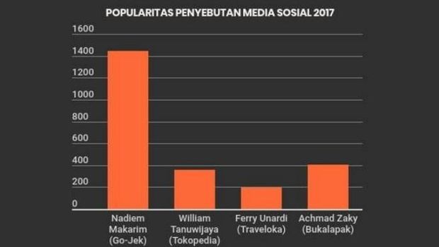 Setelahnya diikuti dengan CEO startup besar lainnya secara berurutan, yaitu Achmad Zaky (CEO Bukalapak) 404 penyebutan, William Tanuwijaya (CEO Tokopedia) 356 penyebutan, Ferry Unardi (CEO Traveloka) 195 penyebutan, dan Kusumo Martanto (CEO Blibli) 78 penyebutan.