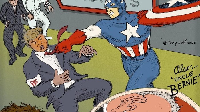 Netizen pun langsung gerak cepat bikin ilustrasi Trump dihajar oleh Captain America.