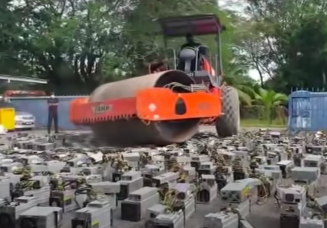 Pemerintah Malaysia menggerebek penambangan mata uang kripto seperti Bitcoin di Serawak. Barang bukti kemudian dimusnahkan dengan cara dilindas dengan kendaraan berat berjenis stoom.
