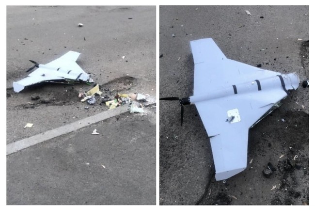 Menteri Dalam Negeri Ukraina memajang drone KUB-BLA milik Rusia rusak di sebuah jalan. Tampaknya, drone itu berhasil ditembak jatuh oleh tentara Ukraina sebelum melancarkan aksinya.
