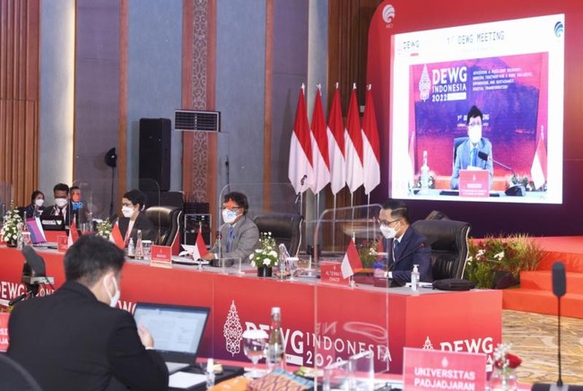 Pertemuan Pertama Kelompok Kerja Ekonomi Digital dibuka oleh Menteri Komunikasi dan Informatika RI, Johnny G. Plate dan dipimpin oleh Chair DEWG Mira Tayyiba dan Alternate Chair Dedy Permadi.