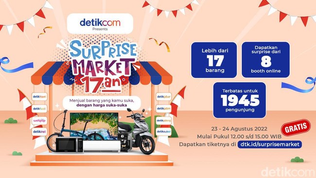 - Dapatkan tiket GRATIS 'Surprise Market 17an detikcom' di dtk.id/surprisemarket paling lambat 24 Agustus 2022.
